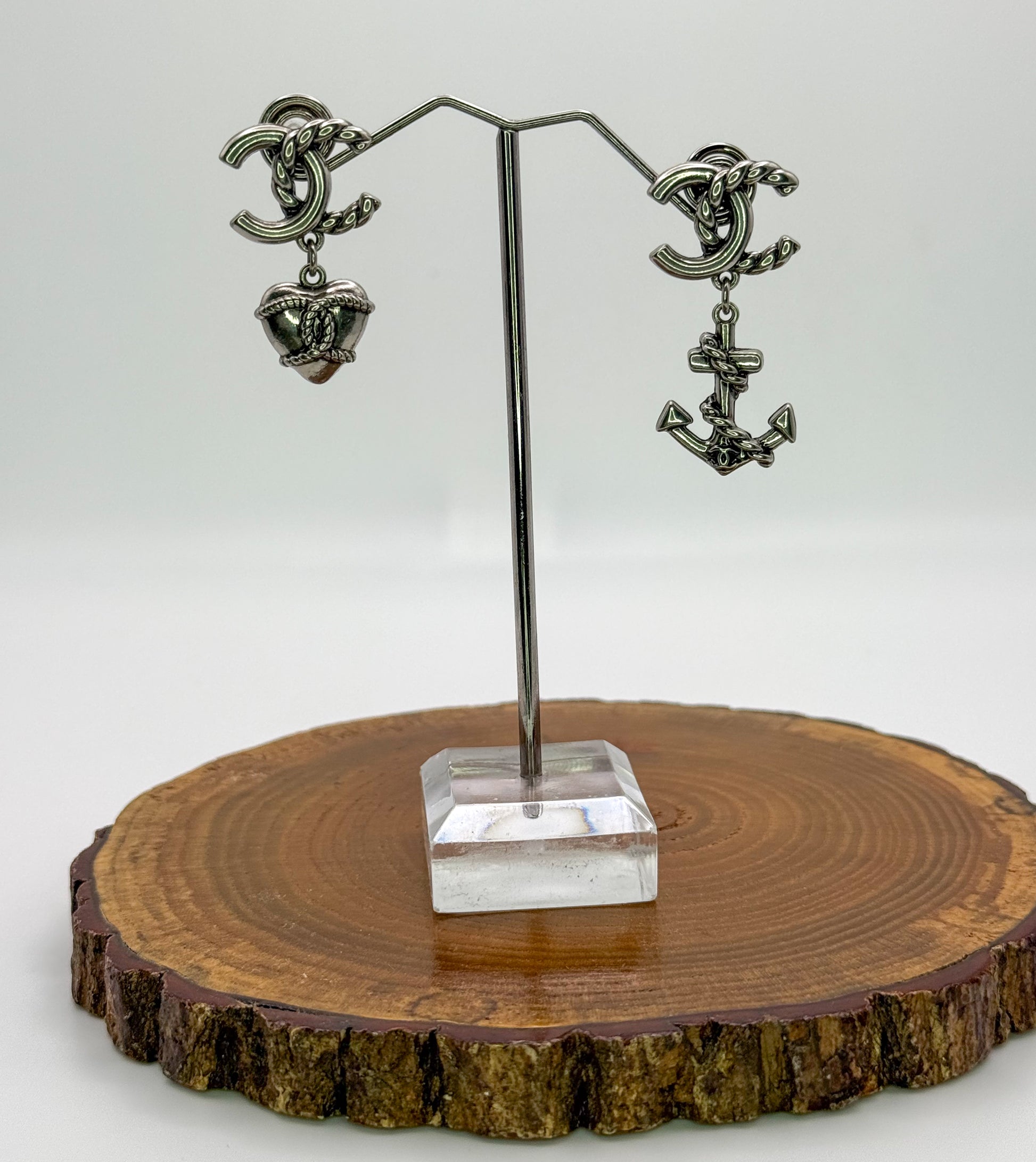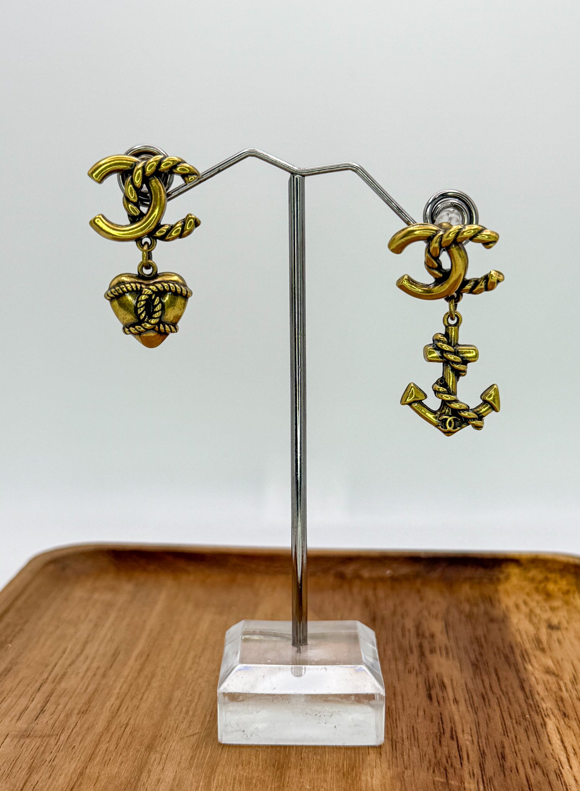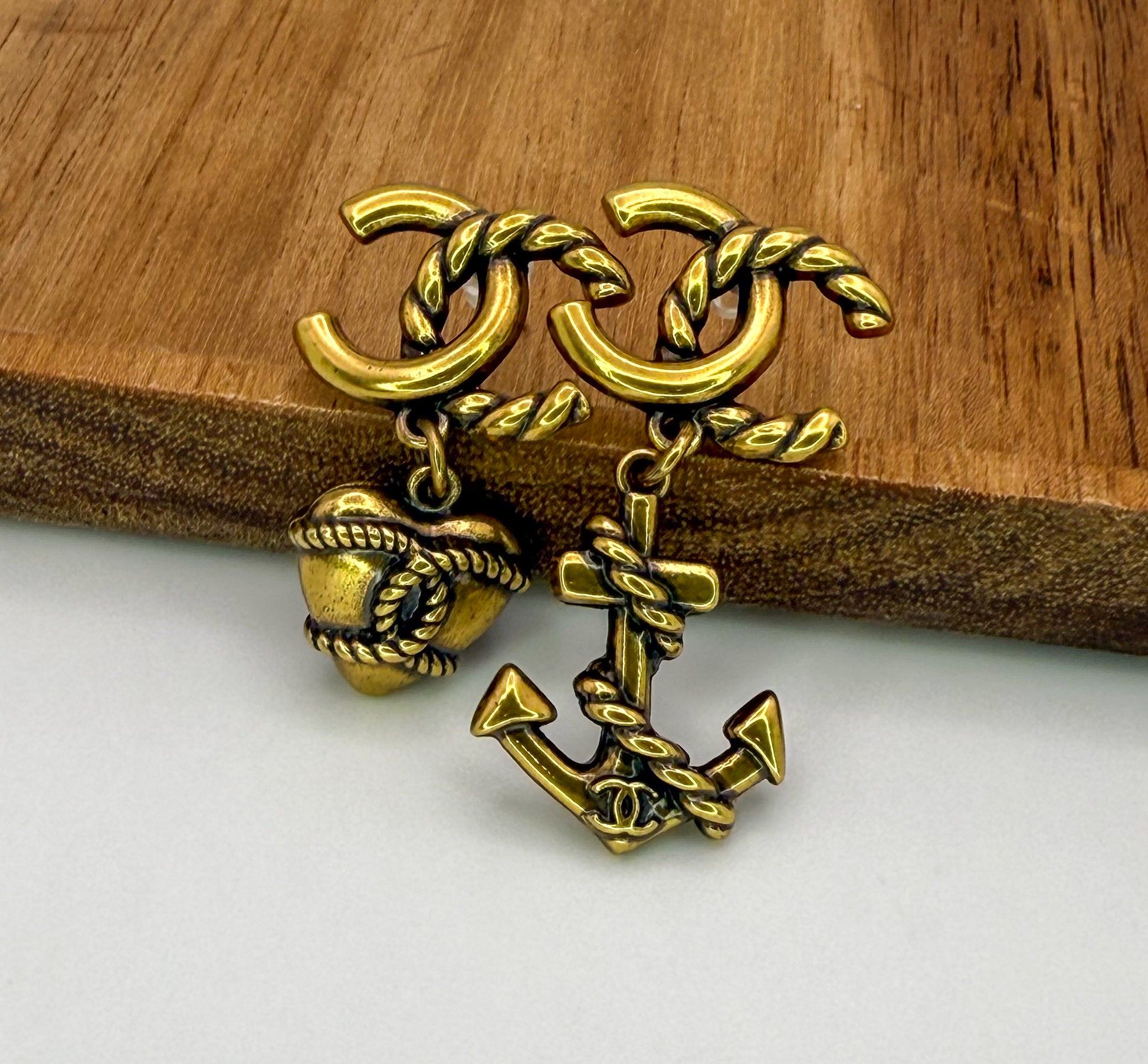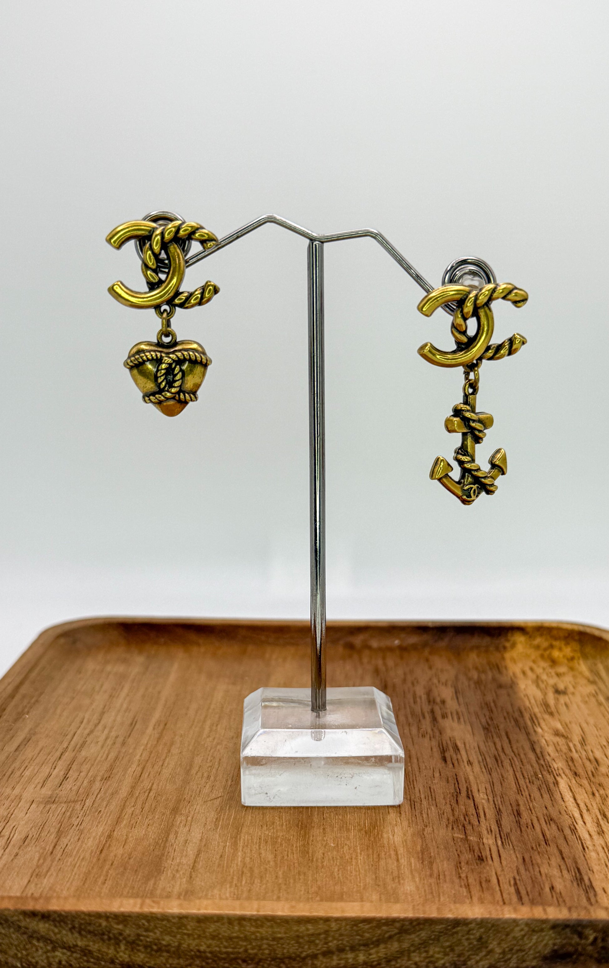 Antique Gold & Silver CC Designer Love & Anchor Stud Dangle Earrings