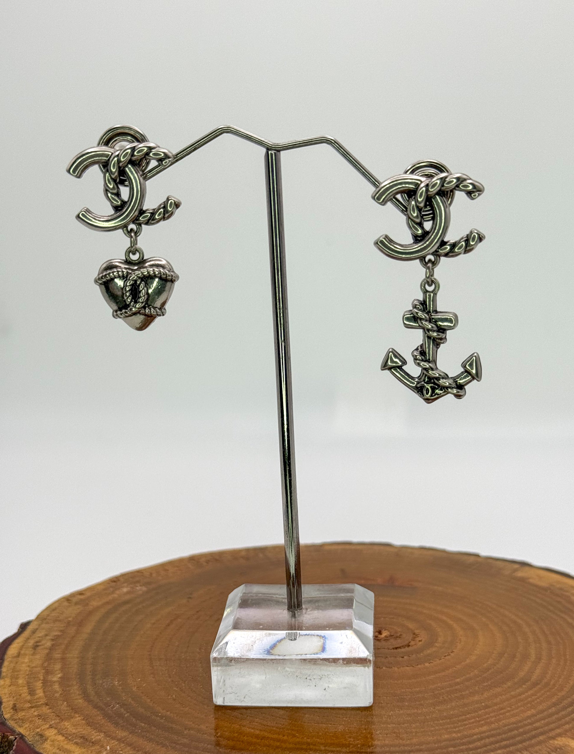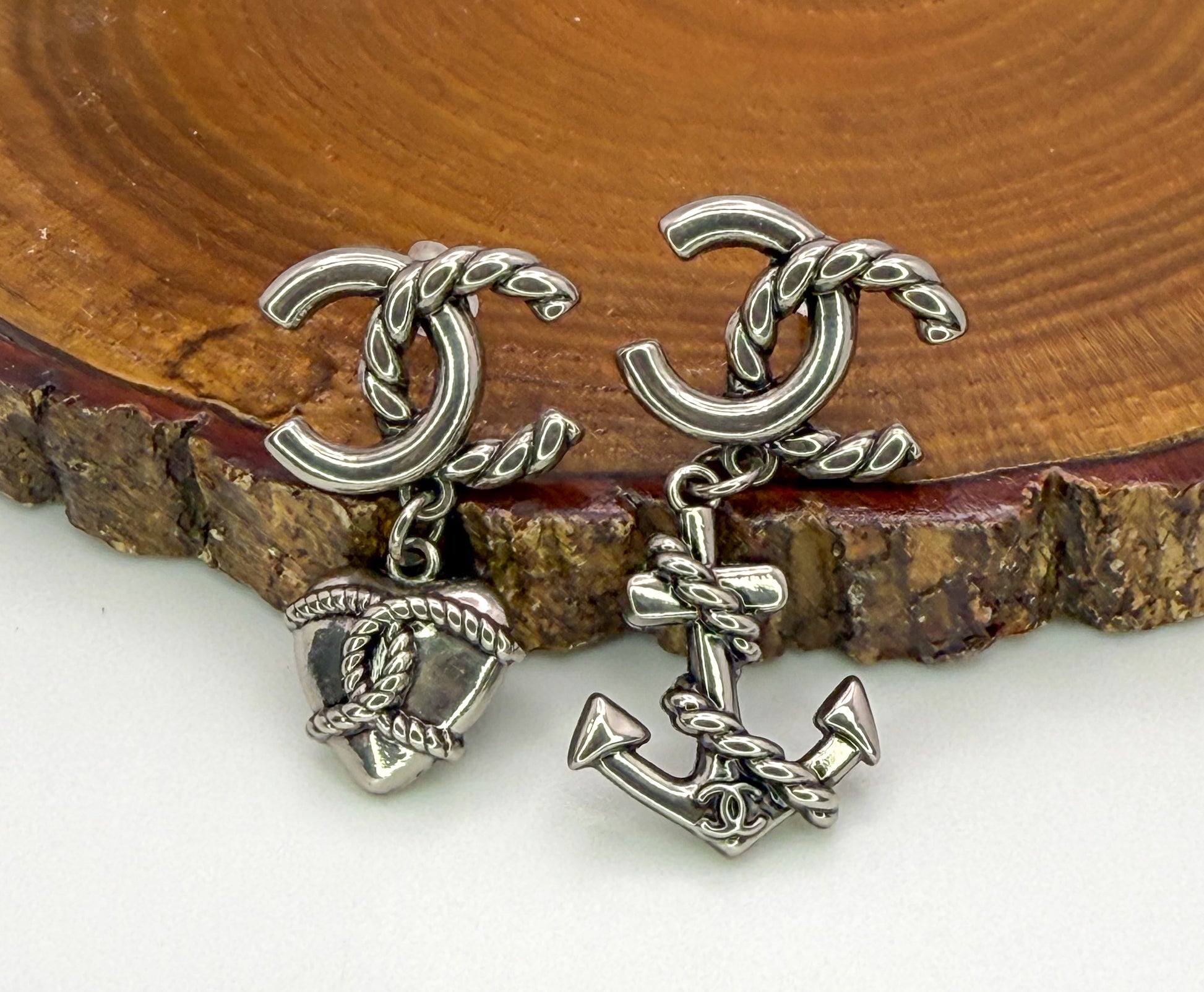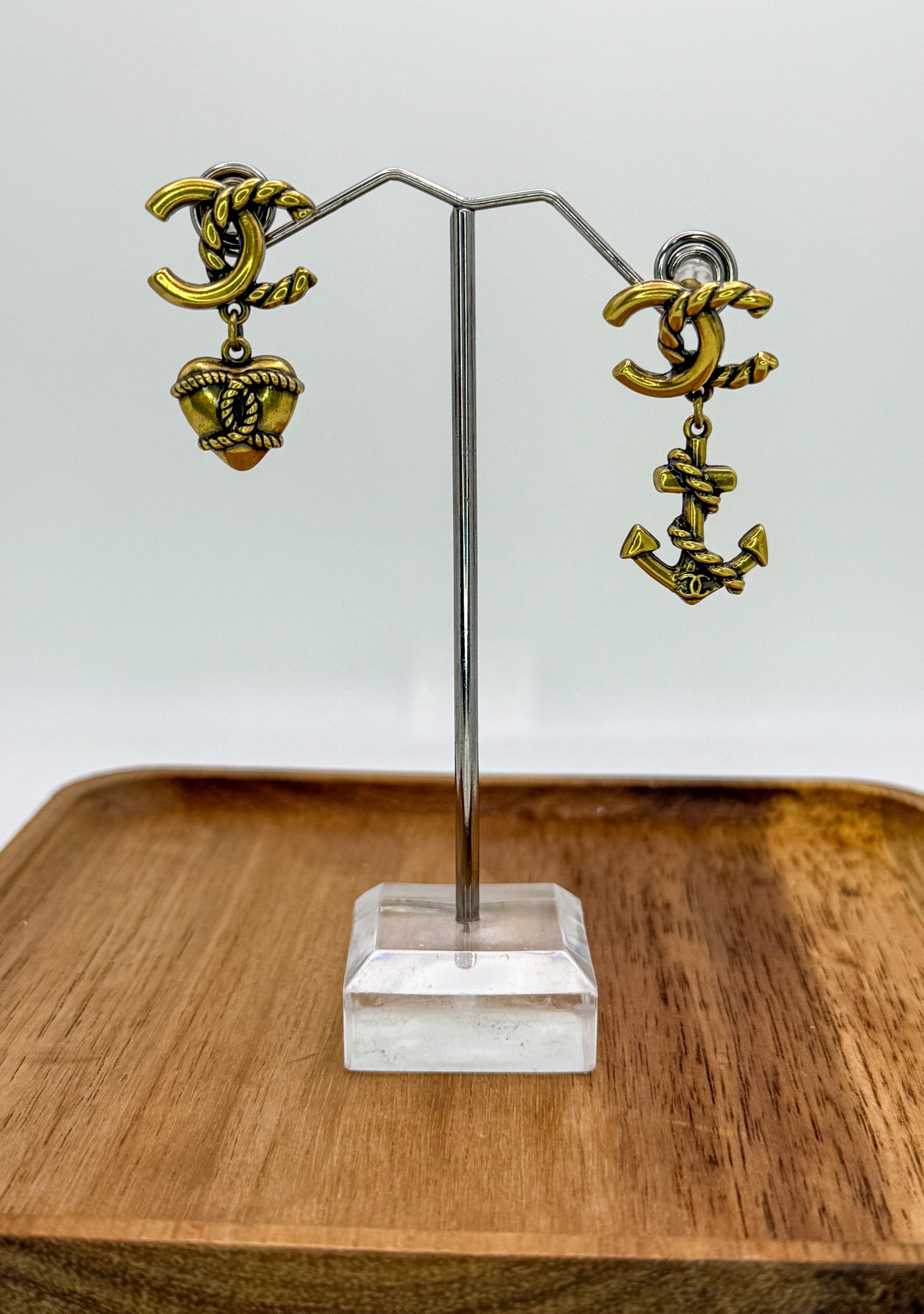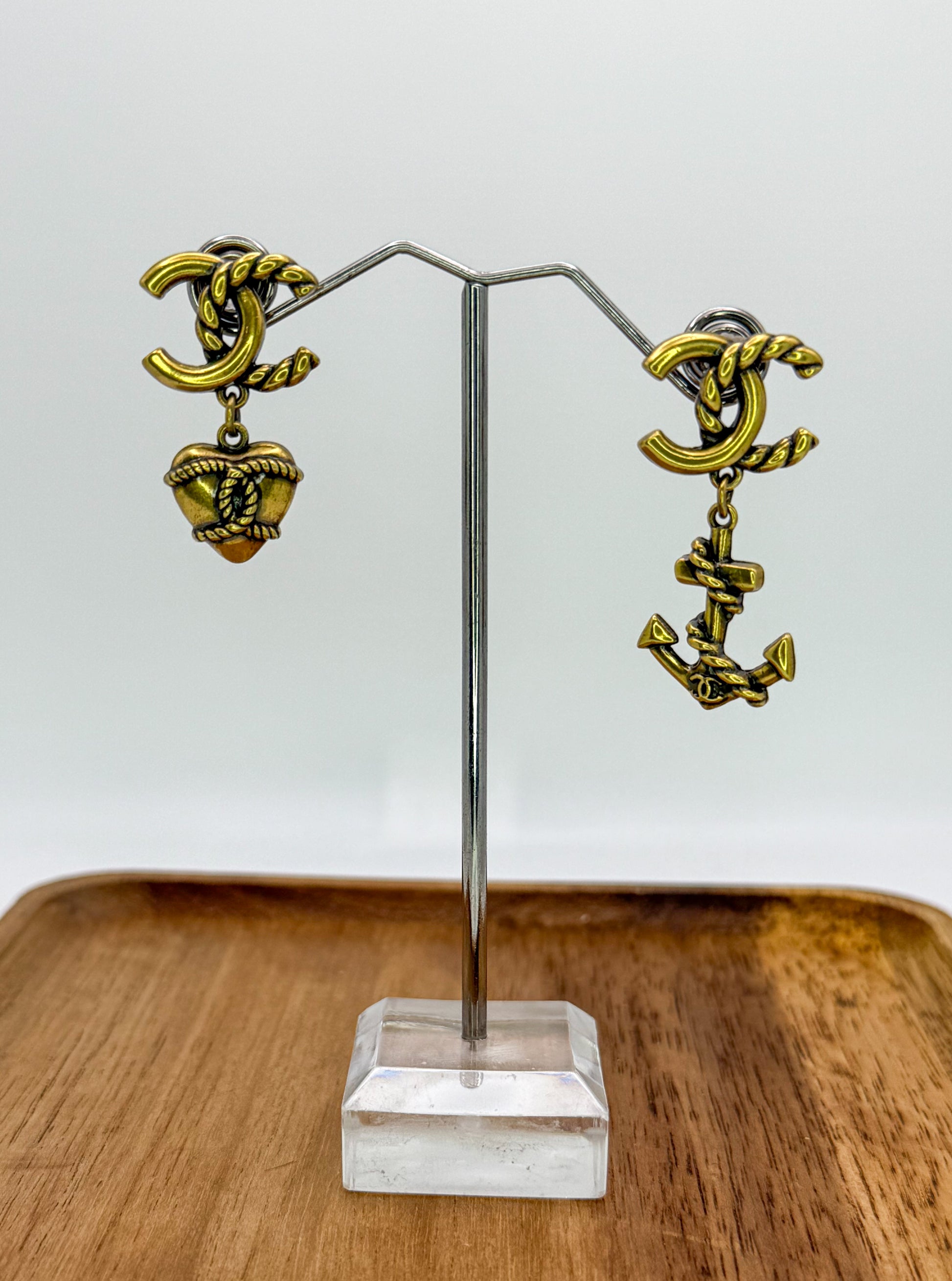 Antique Gold & Silver CC Designer Love & Anchor Stud Dangle Earrings