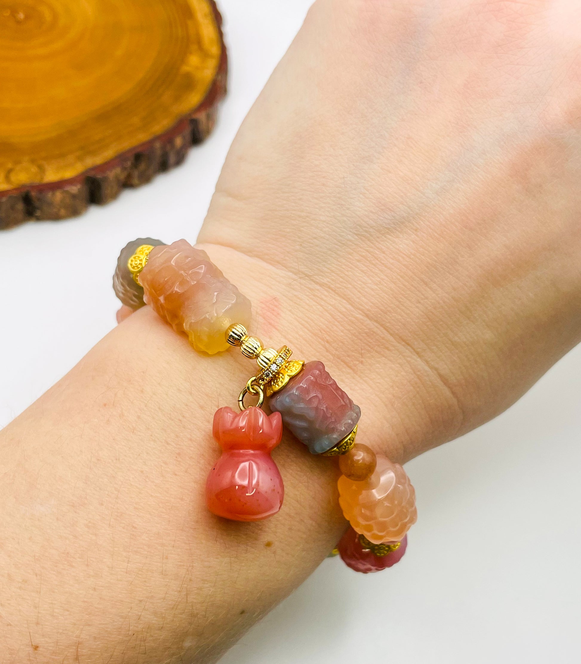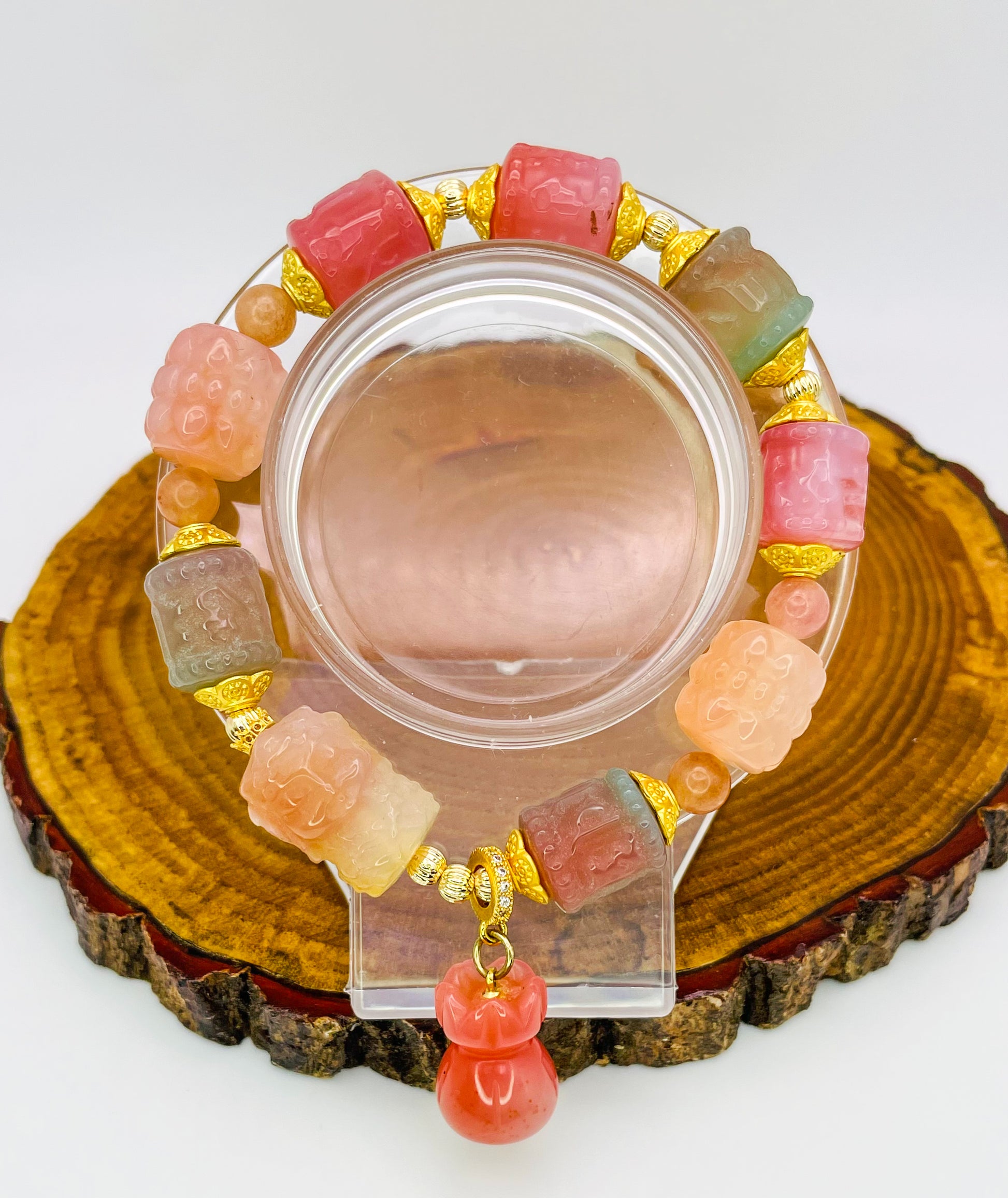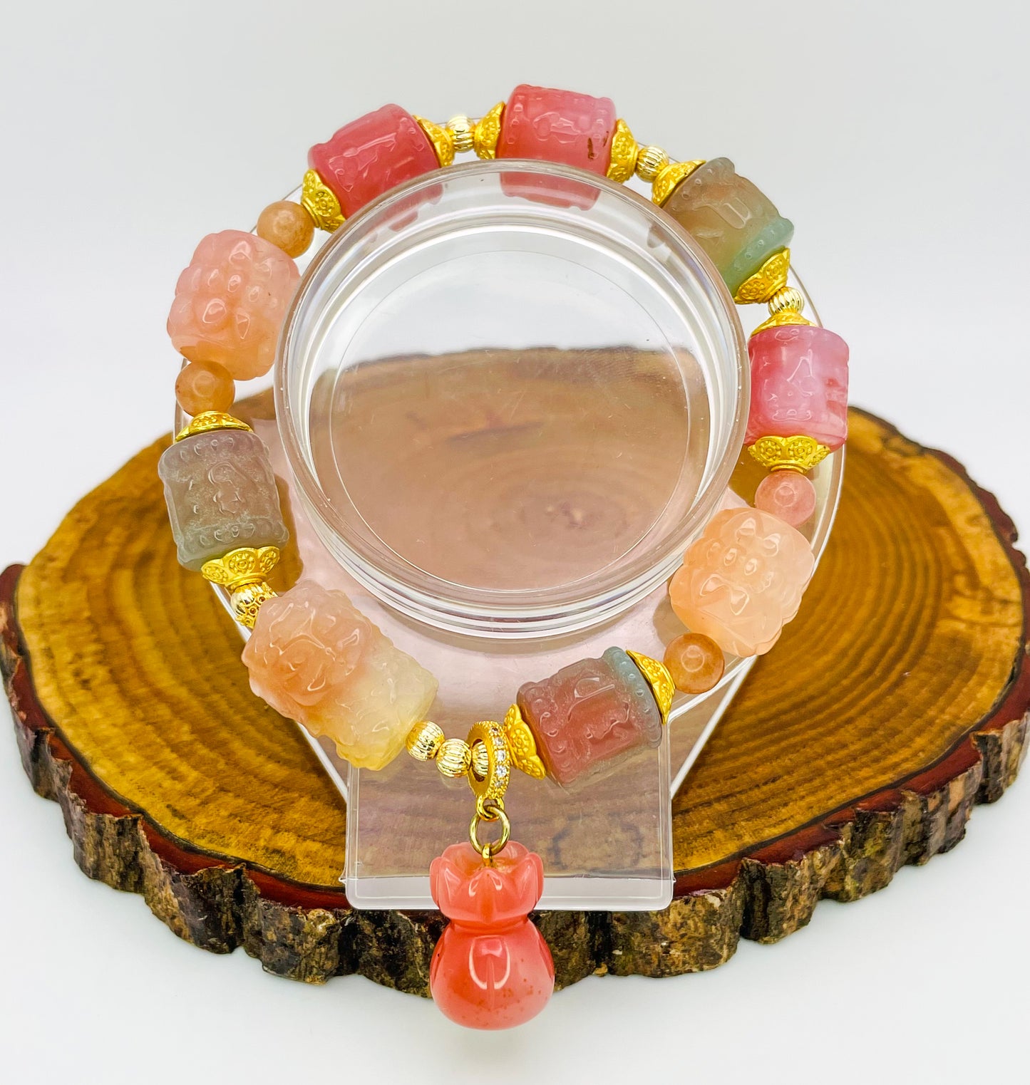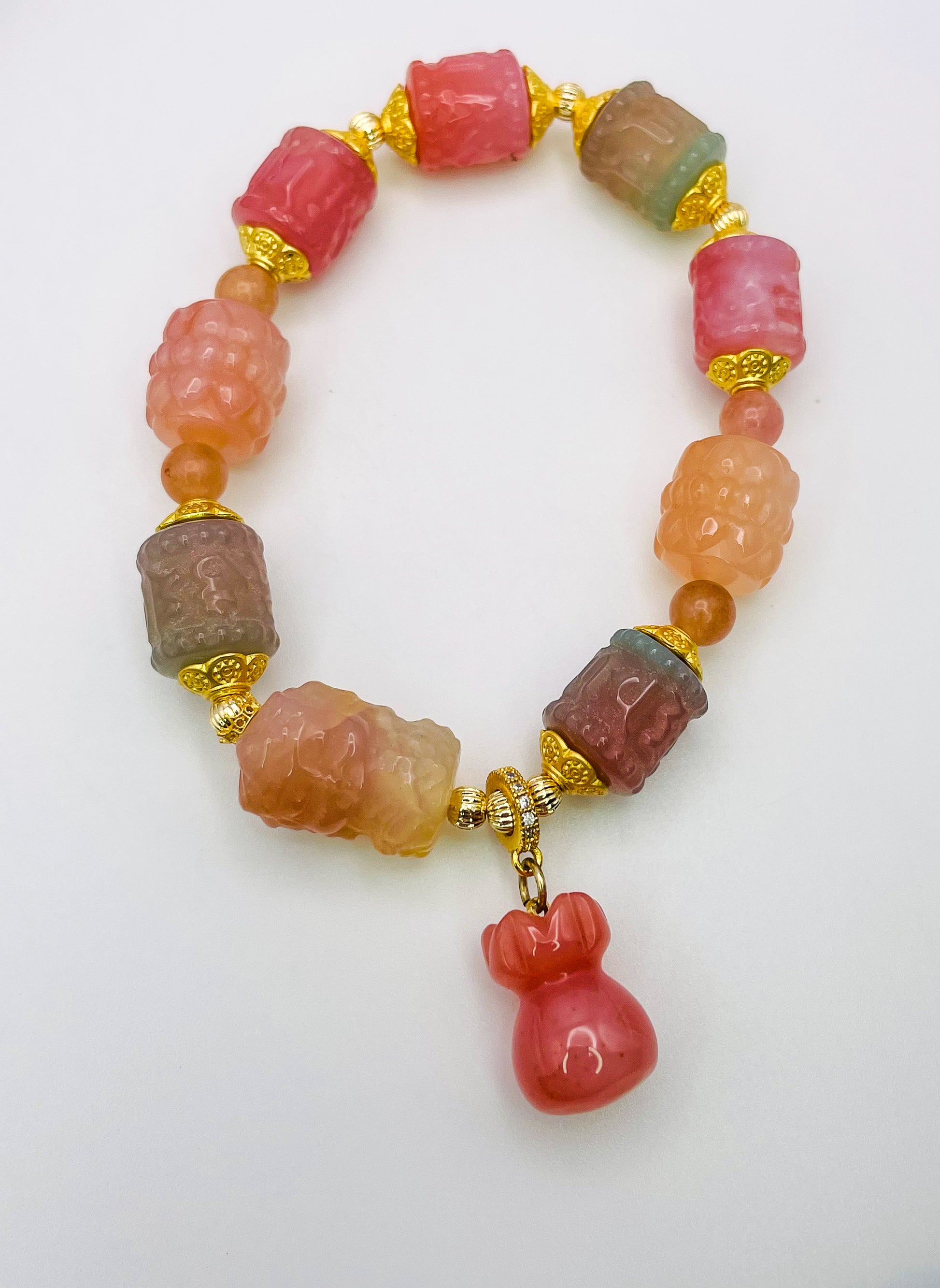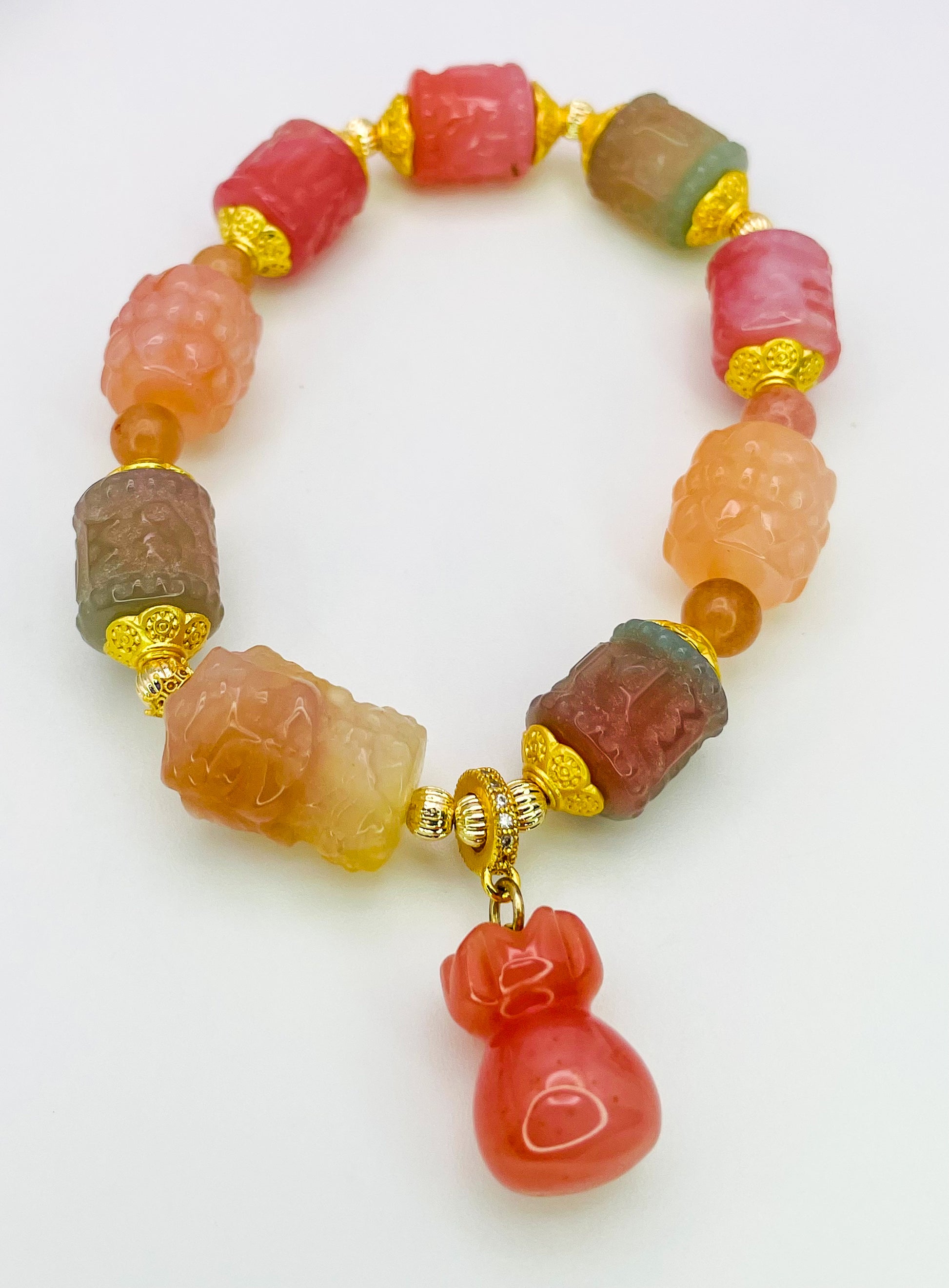 High Quality Natural Yanyuan Agate Crystal Carving Beads and goddess carving bead, strung together, creating a beautiful colorful one of a kind bracelet.