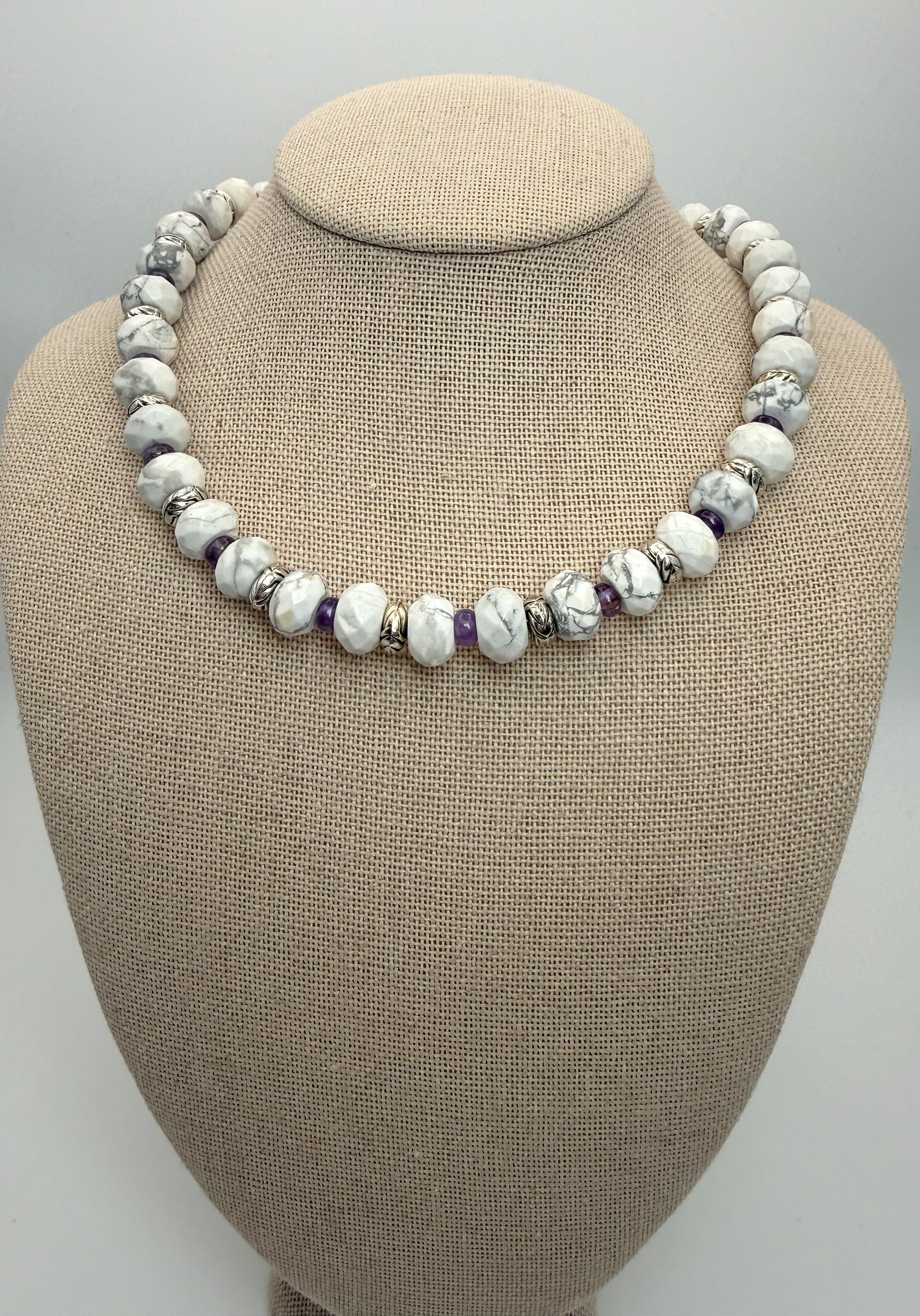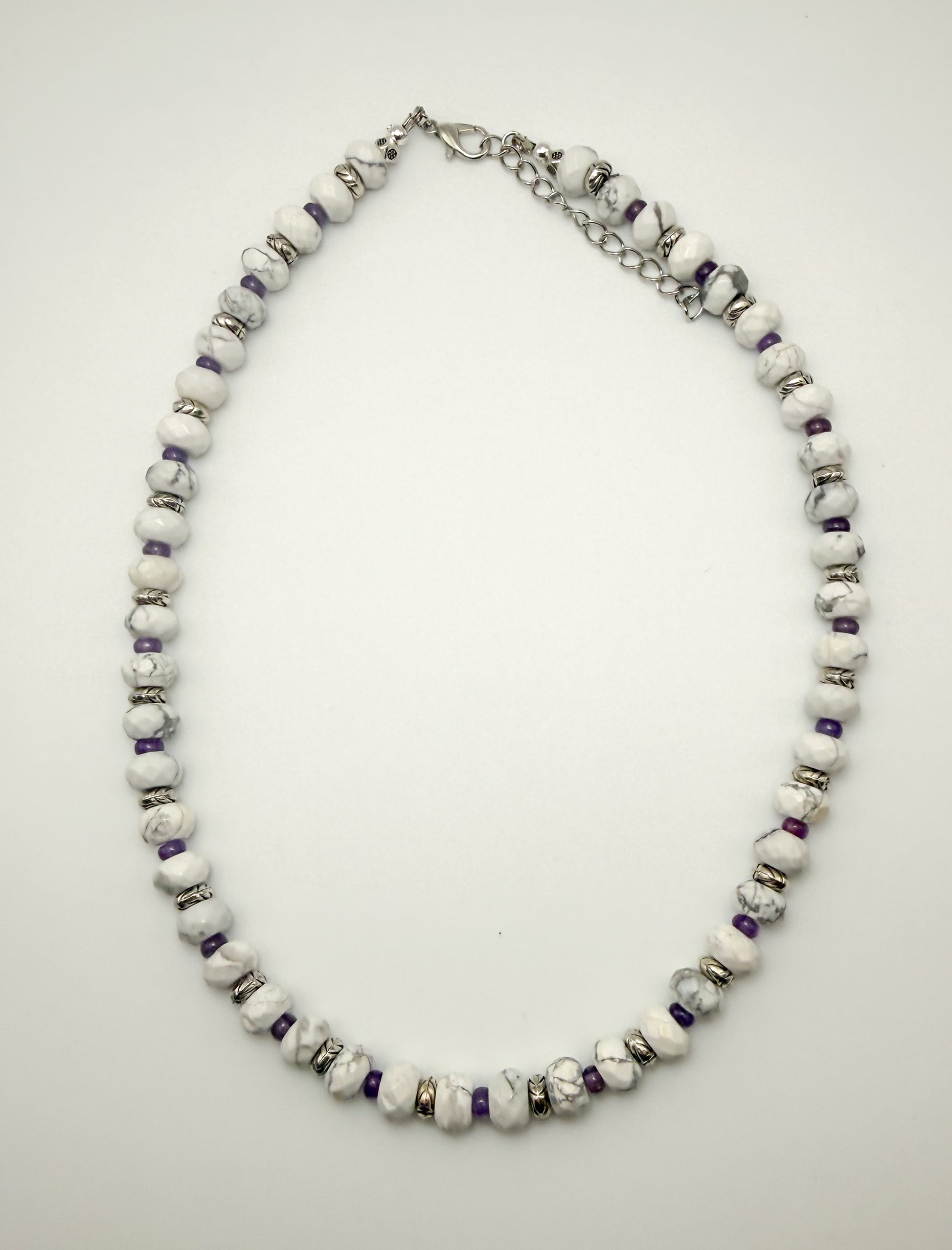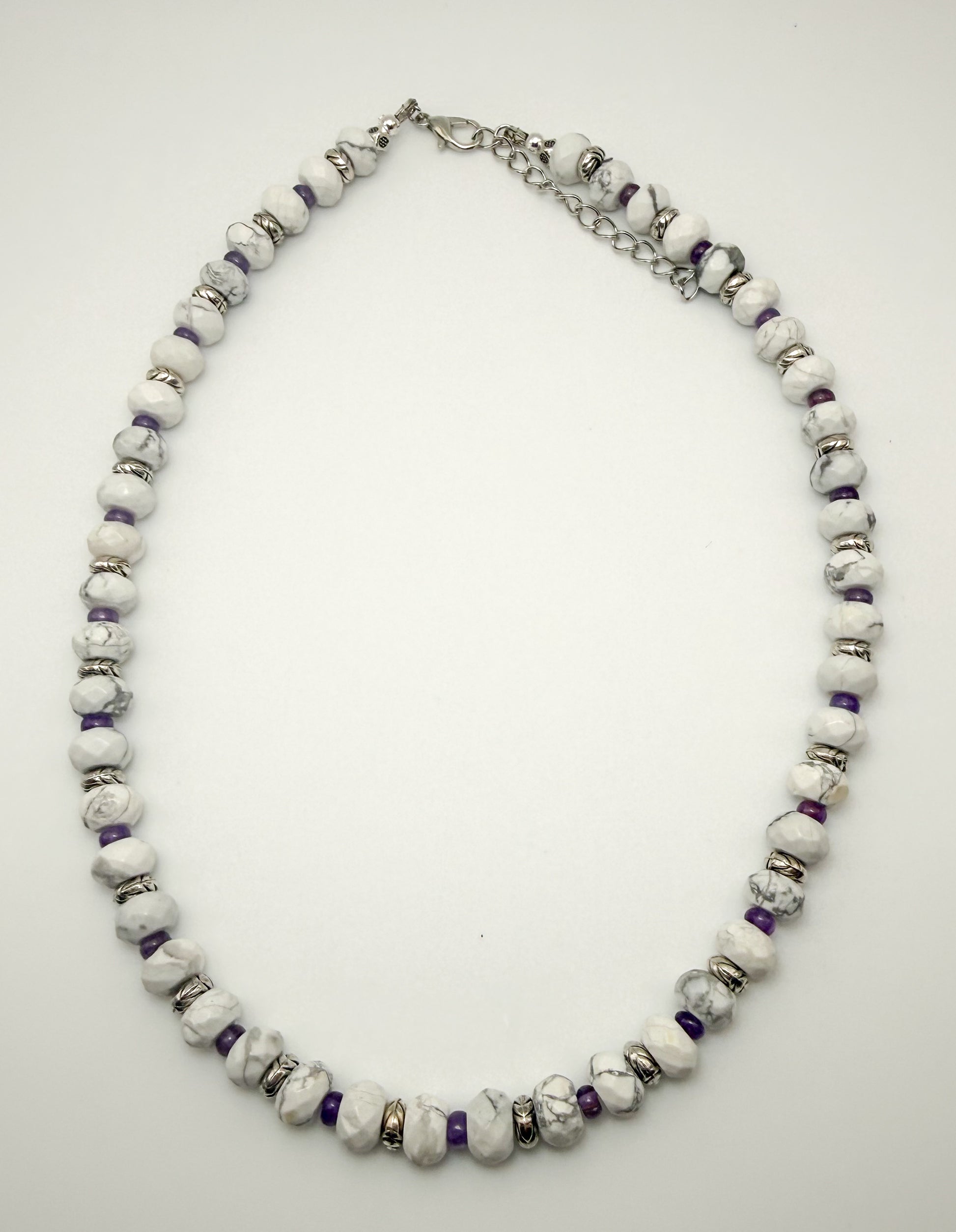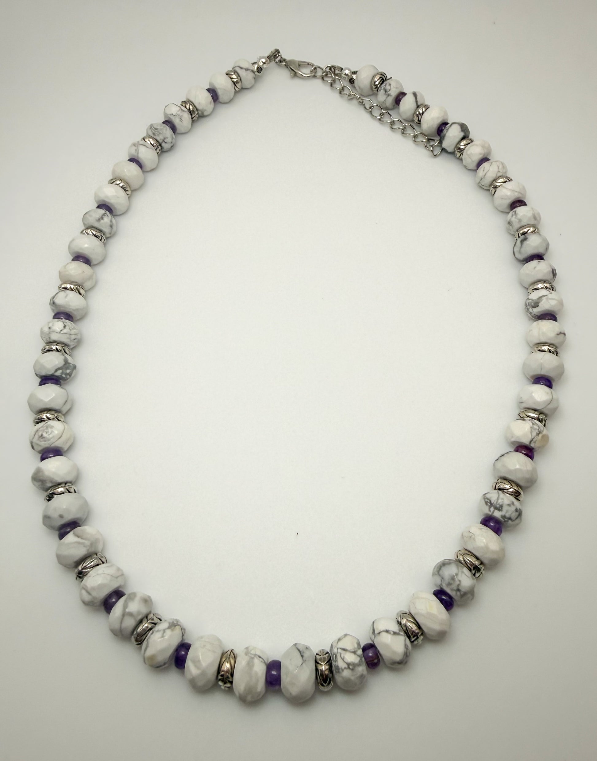 Natural Howlite & Amethyst Crystal Beaded Gemstone Necklace; Faceted Donut style Howlite 8mm beads with 4mm Amethyst bead