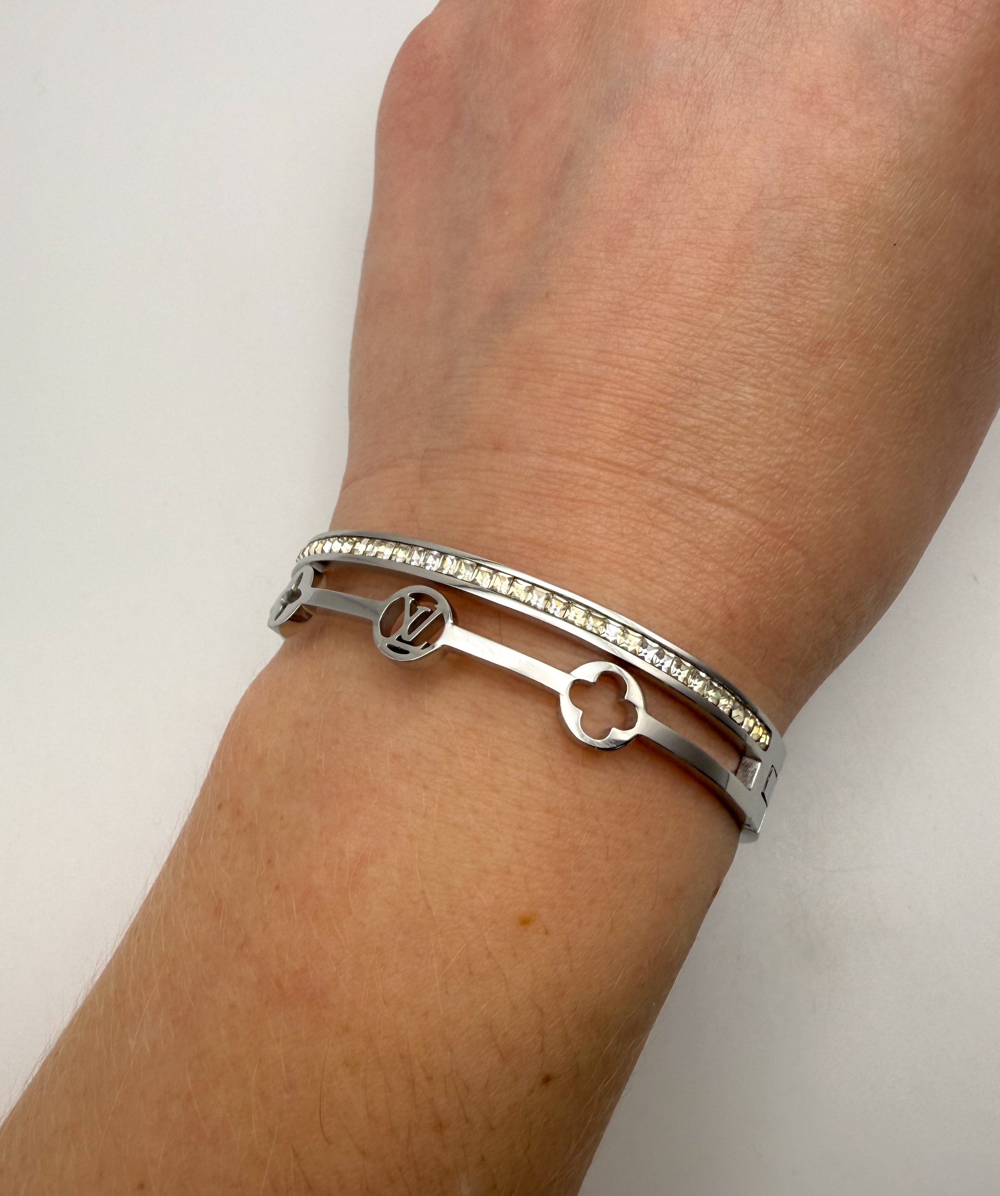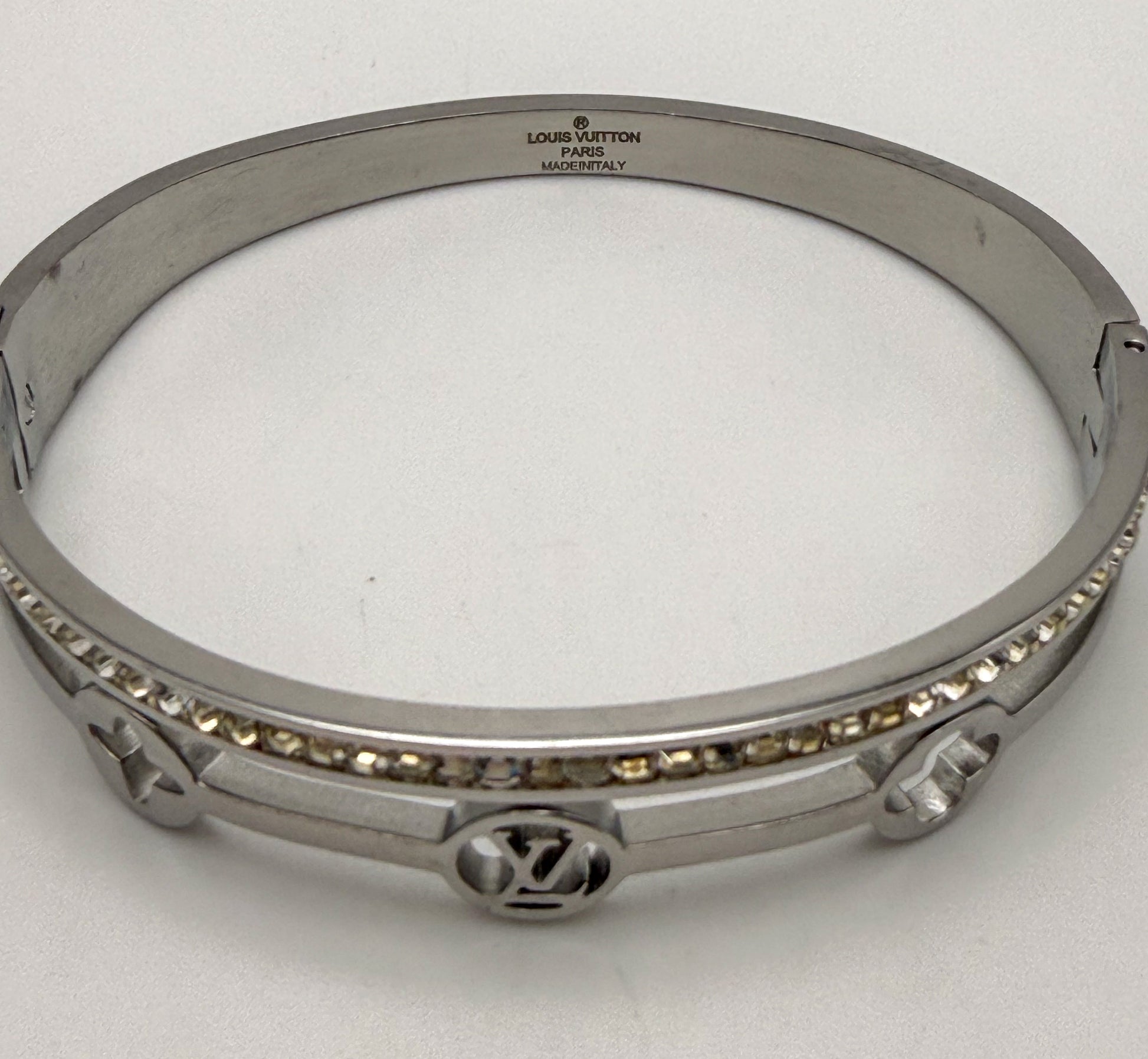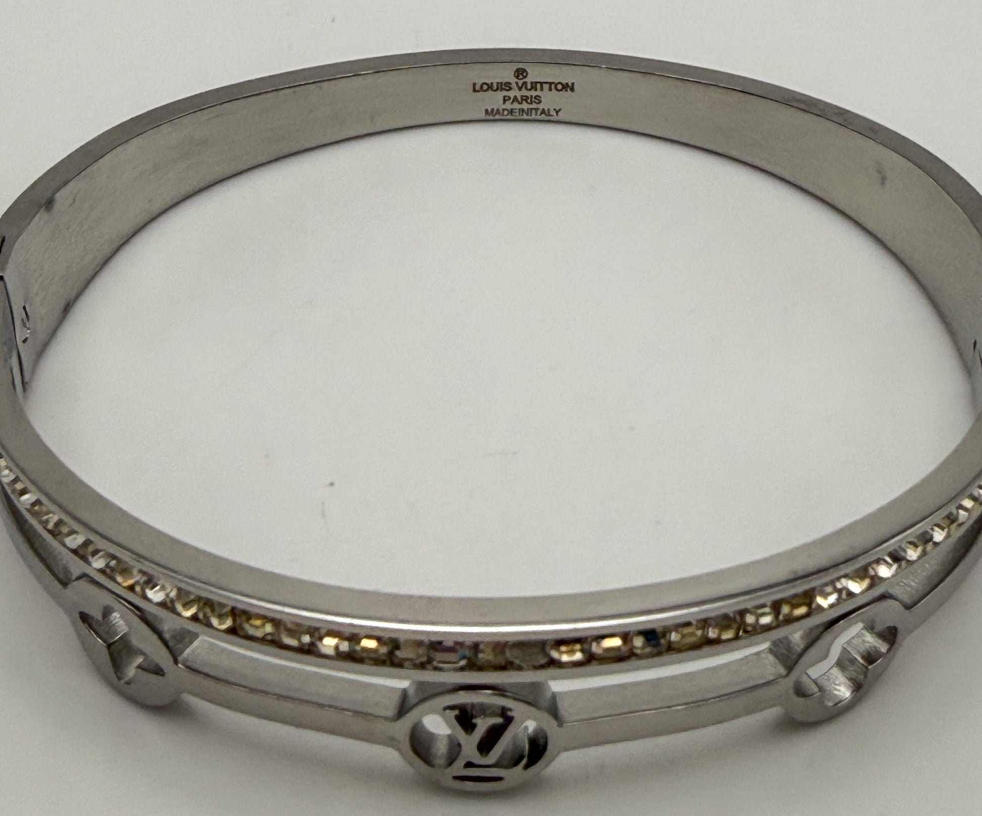 Silver Stainless Steel LV Designer with Rhinestones Bangle Bracelet